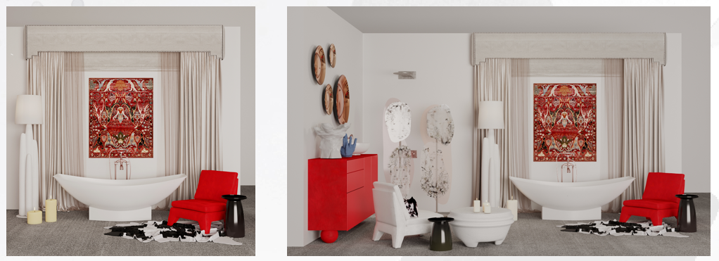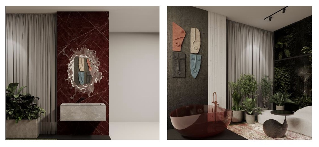 • Валерия Диченскова подготовила ванную комнату «Яркая роскошь» — белое пространство, акцентированное красными деталями и бионическими формами. Эффект усиливают ванна ABBER, авторский текстиль «Текстильной мастерской Виты Ковалёвой», арт-объекты Covali и StekloMet, а также мебель от НСМ – Интерьер и Амиран.